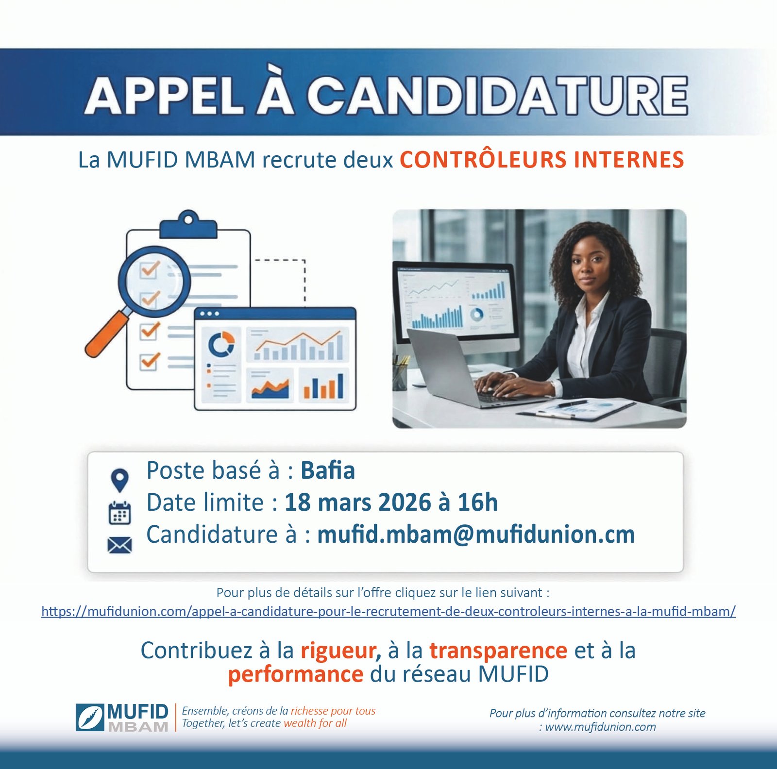 Dans la perspective du renforcement de l’équipe de sa direction générale, particulièrement le contrôle permanent, l’organisation et le suivi de ses activités, la MUFID MBAM est à la recherche de deux Contrôleurs internes pour rejoindre son équipe.