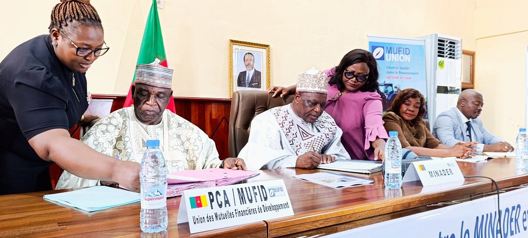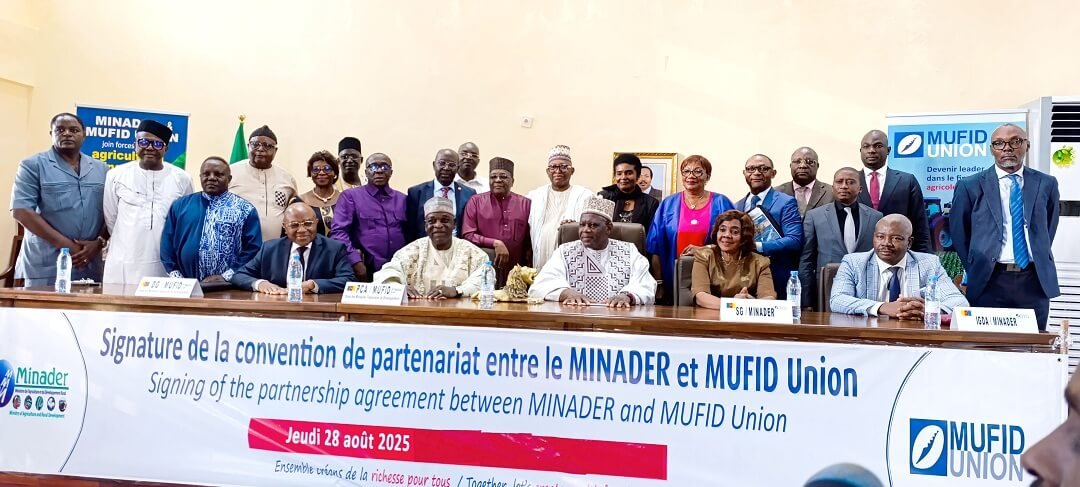 Une étape décisive vient d’être franchie pour le secteur agricole camerounais. Le Ministère de l’Agriculture et du Développement Rural (MINADER) et MUFID Union (Union des Mutuelles Financières de Développement) ont procédé le jeudi 28 août 2025, à la signature officielle d’une convention de partenariat visant à promouvoir le développement et le financement du secteur agricole et rural. La convention a été paraphée par Son Excellence Monsieur Gabriel Mbairobe, Ministre de l’Agriculture et du Développement Rural, et Monsieur Ally Ibrahim, Président du Conseil d’administration de MUFID Union au cours d’une cérémonie qui a réuni plusieurs acteurs institutionnels, coopératifs et financiers, dont le Directeur Général de MUFID Union, Dr Justin BOMDA et les membres des organes élus de cette Union. Le partenariat permettra de faciliter l’accès des producteurs aux services financiers adaptés, de soutenir la modernisation des exploitations agricoles et de renforcer les capacités des coopératives et groupements agricoles. C’est donc un levier pour le secteur agricole. « En s’appuyant sur des acteurs solides comme MUFID Union, nous renforçons notre capacité à bâtir une agriculture moderne et inclusive », a déclaré le Ministre de l’Agriculture et du Développement Rural.